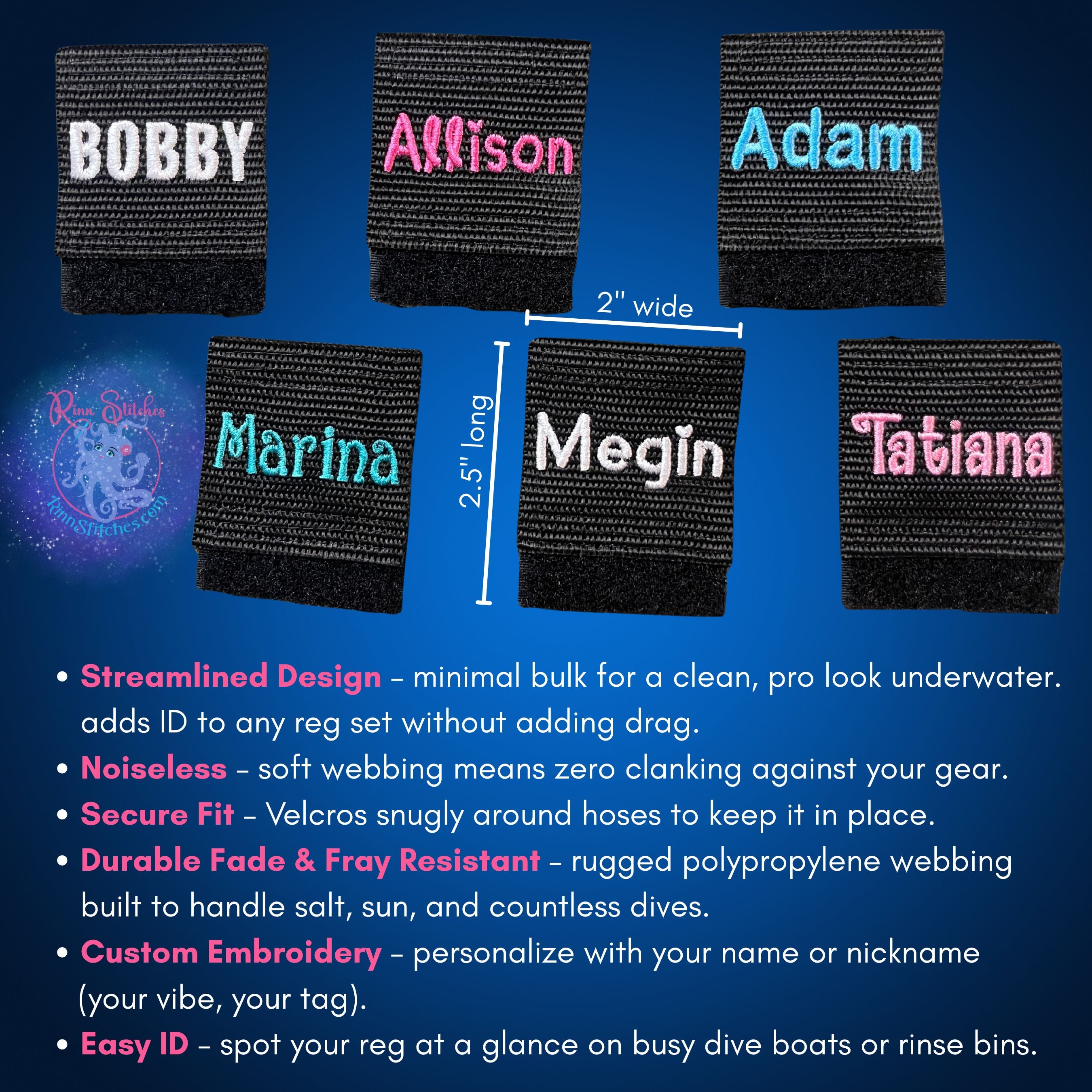 Whether you’re a pro diver, instructor, or weekend explorer, these tags make it effortless to spot your reg at a glance on crowded dive boats or rinse bins. Choose your name, font, and thread color to match your vibe and make your setup stand out, quietly and stylishly.